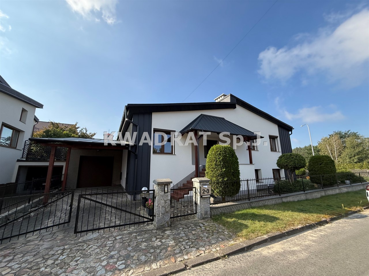 Przy budynku mamy garaż z dodatkową wiatą na drugi samochód.