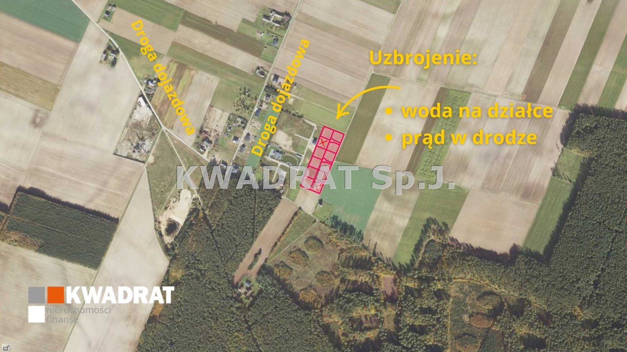 Działki położone są bezpośrednio przy drodze gminnej. Droga dojazdowa o małym natężeniu ruchu, co bezpośrednio przekłada się na spokojną i cichą okolicę. Sąsiedztwo to luźna zabudowa domami jednorodzinnymi. Bezpośrednie otoczenie - las oraz łąki i pola.