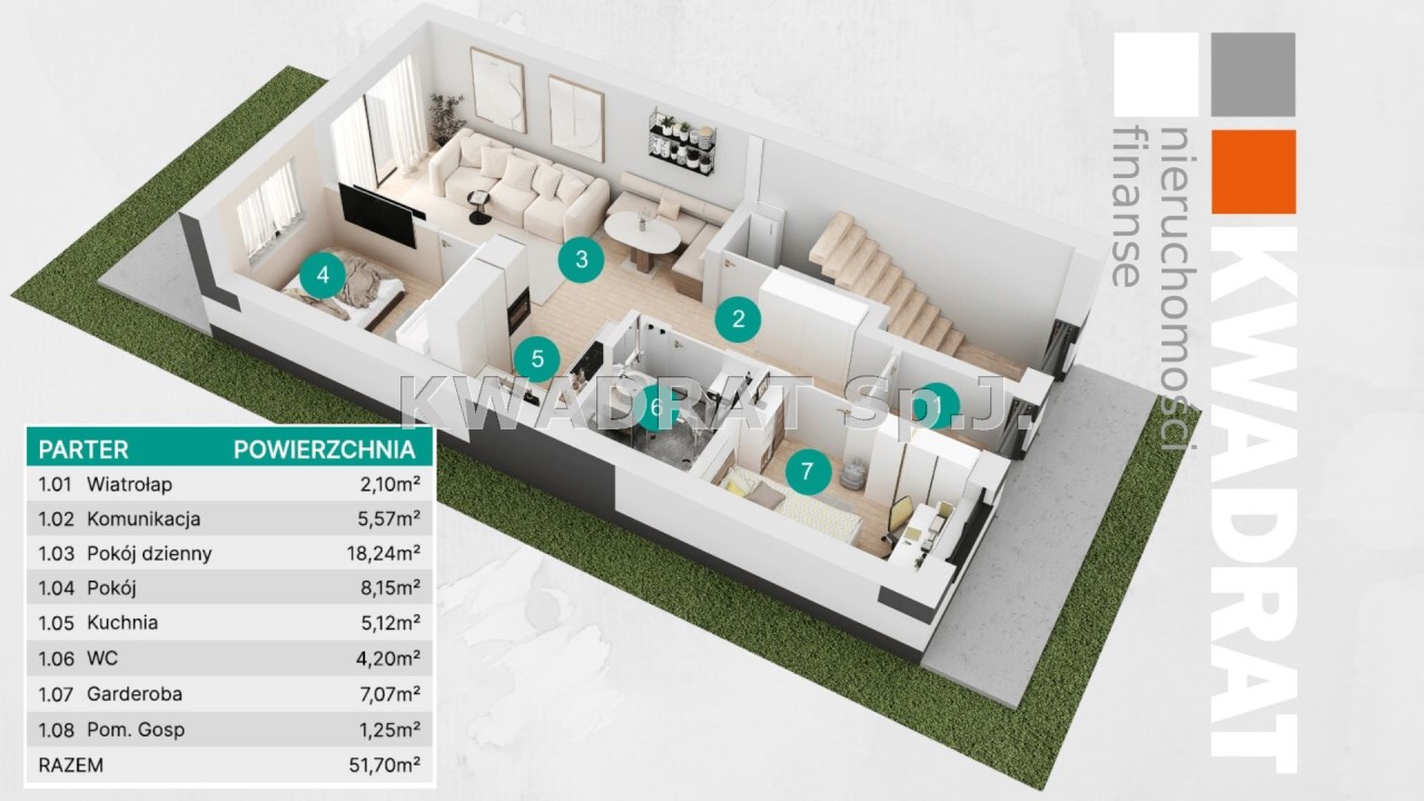 - 51,70 m2 (parter – ogród, salon z aneksem kuchennym i dwie sypialnie)