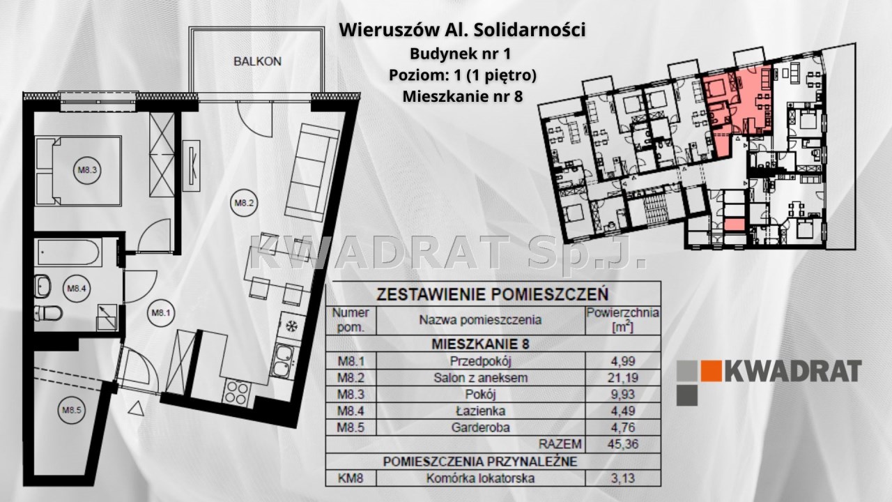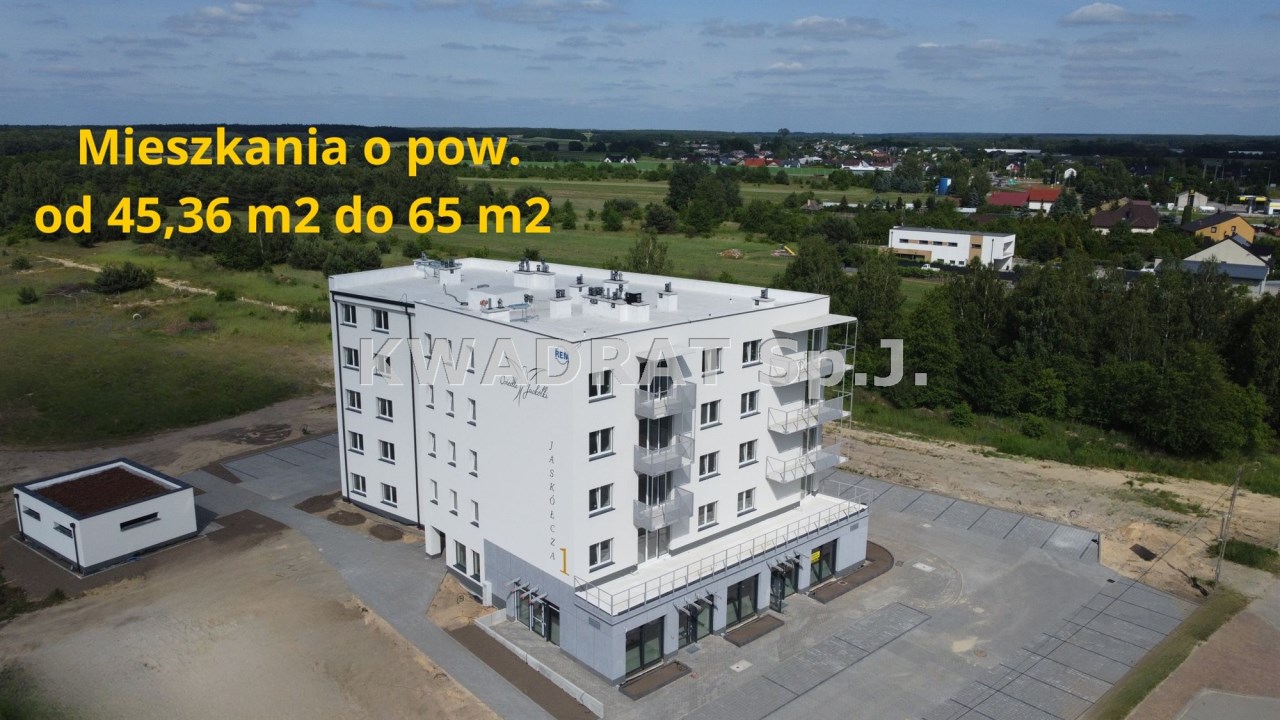Prezentowany lokal znajduje się na pierwszym piętrze budynku i ma powierzchnię 45,36 m². W jego skład wchodzą: przestronny salon z aneksem kuchennym, sypialnia, garderoba oraz łazienka. Z salonu prowadzi wyjście na balkon, idealny do relaksu.