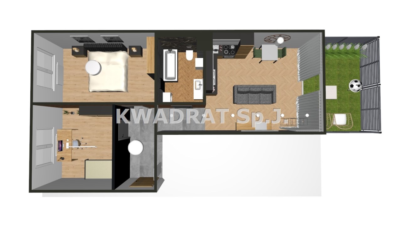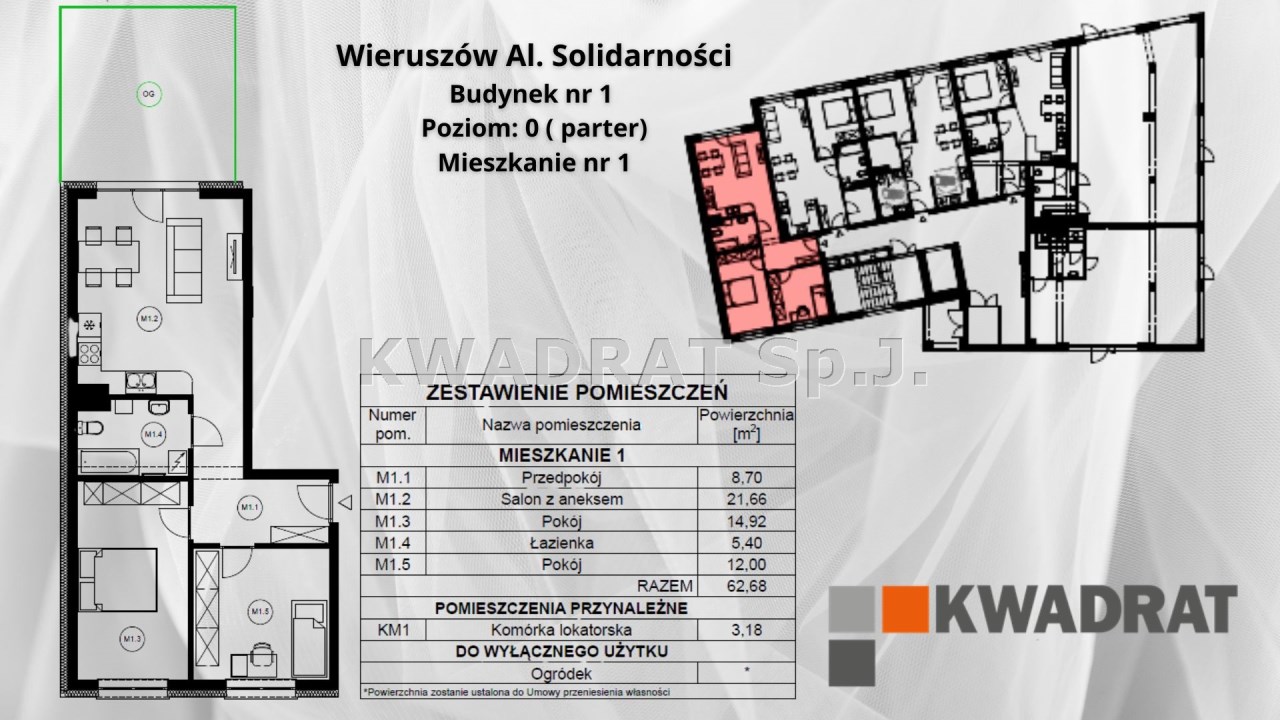 Prezentowany lokal znajduje się na parterze budynku i ma powierzchnię 62,68 m². W jego skład wchodzą: przestronny salon z aneksem kuchennym, sypialnia, dodatkowy pokój, łazienka oraz przedpokój. Z salonu prowadzi wyjście na ogródek, idealny do relaksu.